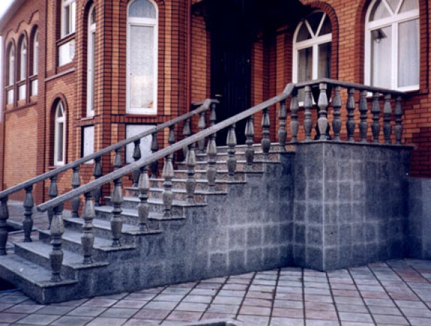 Натуральный камень является одним из самых подходящих для создания входных групп материалом. Он не боится воды, так как имеет минимальное водопоглощение. Его строение позволяет выдерживать резкие перепады температуры и изменение погодных условий. Ступени из гранита, травертина или мрамора, входящие в ансамбль входной группы, наряду с балясинами, перилами и другими декоративными частями, не подвержены истиранию и воздействию химических веществ. Гранитные или произведенные из других пород элементы фасада, не требуют специального ухода, их легко очистить от загрязнений.
