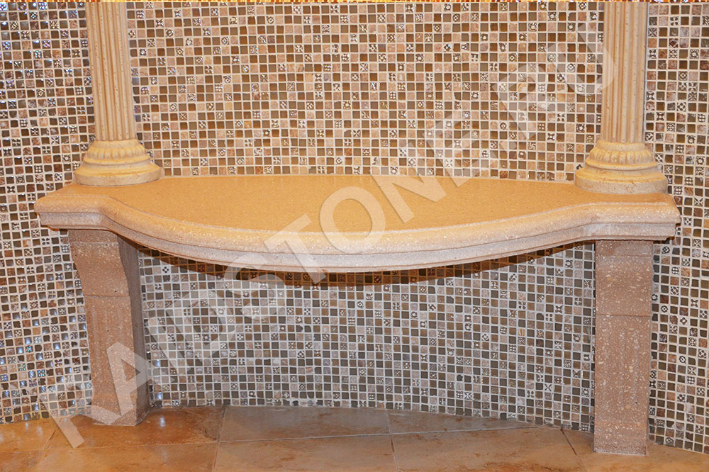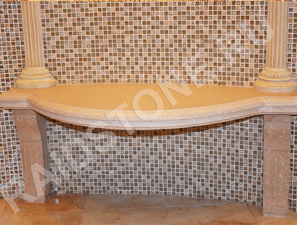 Сиденье , опорные ножки и декоративные рамы изготовлены из декоративного бетона по технологии АрКон, в состав изделий входит крошка натурального травертина со связующим компонентом, что делает его более устойчивым.