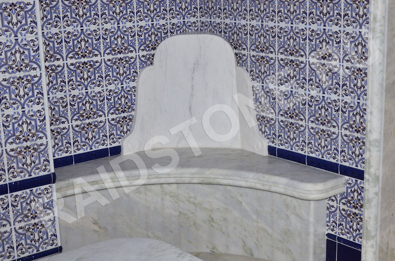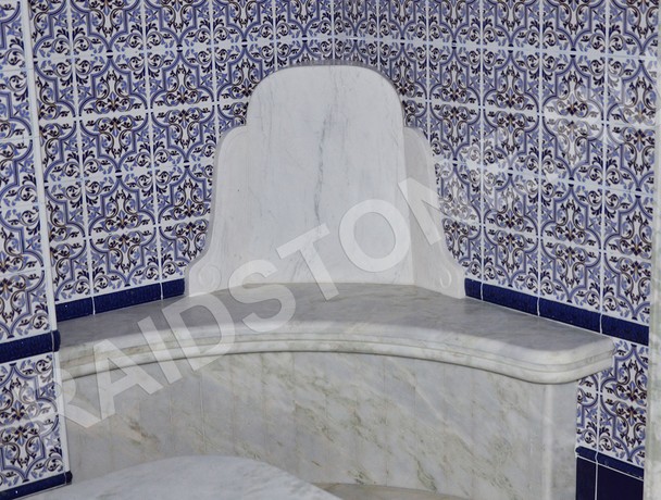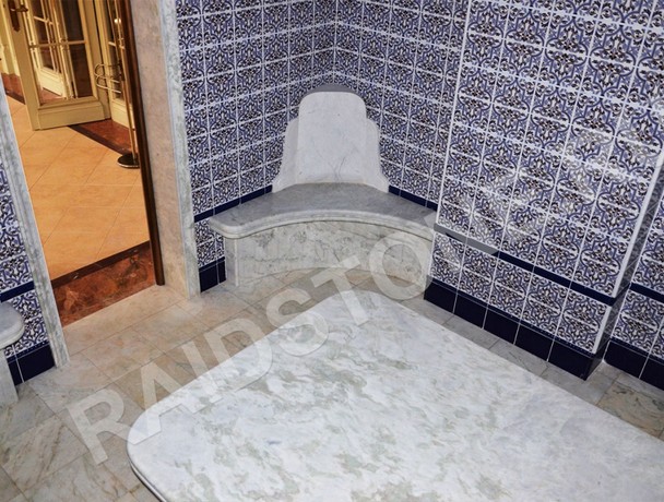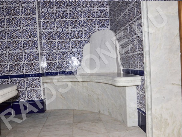 Облицовка сиденья в турецкой бани мрамором Мисти вайт роуз.