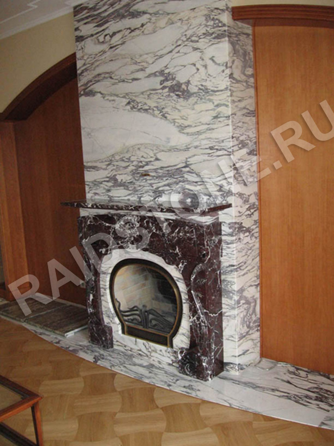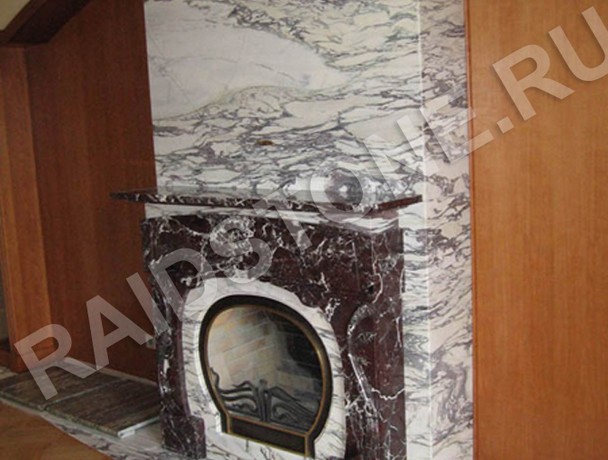 Портал изготовлен из мрамора двух сортов. Основная часть – Арабескато: итальянский белый мрамор с серыми прожилками, создающими оригинальный рисунок. Передняя часть портала и узкая каминная полка сделаны из Россо Леванте – темного натурального материала с белыми прожилками. Такая комбинация подчеркивает четкие графичные линии облицовки и создает интересный контраст. Эффект усиливается за счет разницы фактур мрамора и кованого металла.