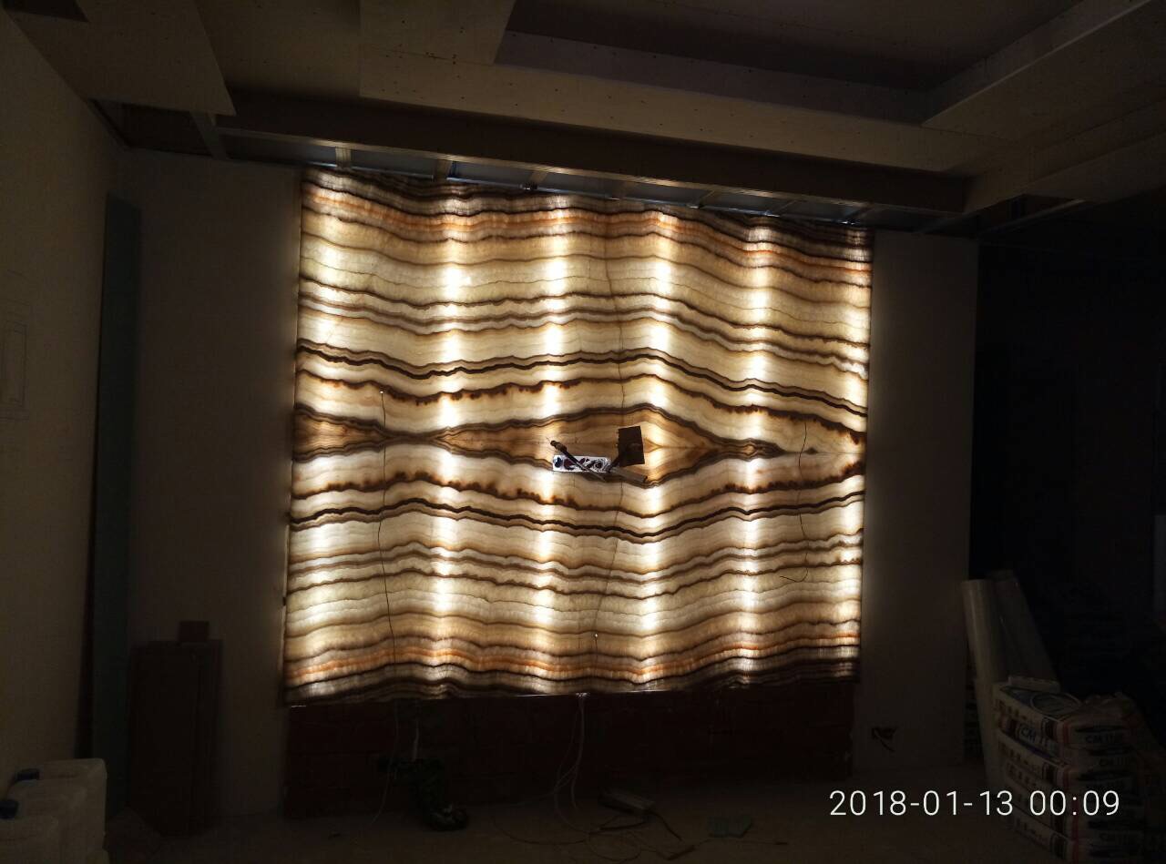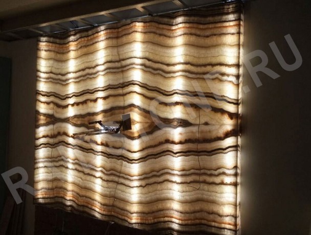 Наша компания изготавливает декоративные панно из оникса с установкой на стену и подключением светодиодной подсветки. Одной из последних работ компании Raidstone стало панно из итальянского оникса Миэль, предназначенное для установки под телевизор. Оникс – уникальный природный камень со слоистой структурой и светопроницаемостью. Слои минерала образуют уникальный природный рисунок, он будет неповторимым для каждого слэба.