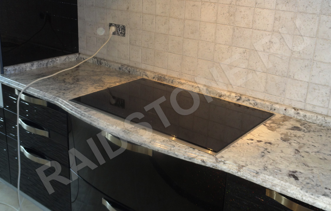 Столешница прямоугольной формы изготавливается из гранита Айс Вайт белого цвета и эффектными серыми разводами. У нее имеется фигурная кромка, готовые вырезы под мойку, плиту, электропроводку и смеситель. Размер 1800х650 х30мм., поверхность полированная