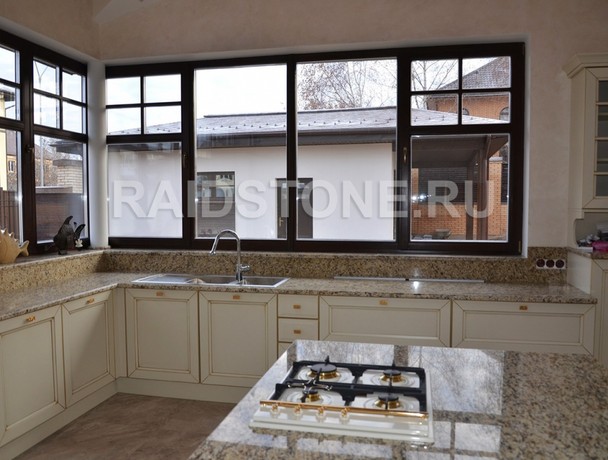 Бразильский гранит Санта Сицилия, с разводами оттенка золотого и серого на белом фоне, отлично сочетается с белой мебелью и золотистыми элементами интерьера кухни. Кухня 24м2, с большими окнами и нестандартным потолком высотой 3,5м, позволяет разместить гарнитур в центре комнаты, так называемым островком. В кухне гранитом отделаны также подоконники и фартуки. Гранит в кухне — самое удобное решение, так как гранит имеет высокий коэффициент очистки, легко восстанавливается, и удобен в уходе.
