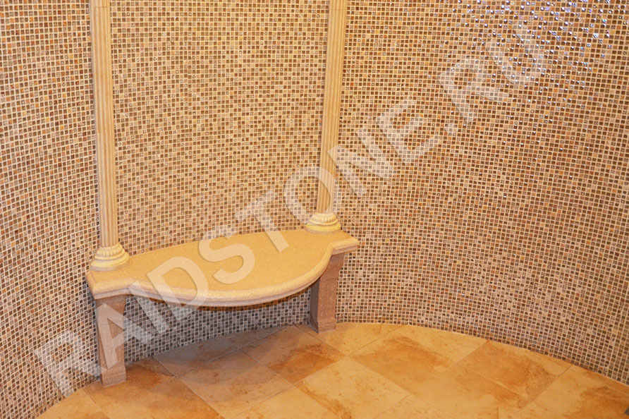 Сиденье , опорные ножки и декоративные рамы изготовлены из декоративного бетона по технологии АрКон, в состав изделий входит крошка натурального травертина со связующим компонентом, что делает его более устойчивым.