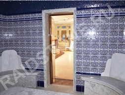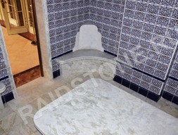 Облицовка сиденья в турецкой бани мрамором Мисти вайт роуз.