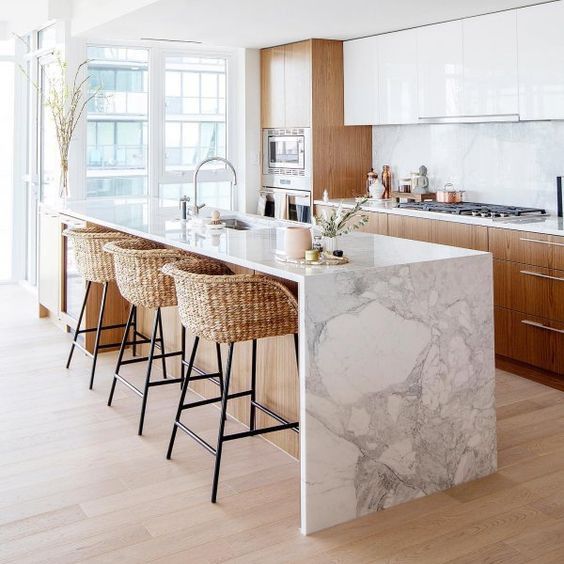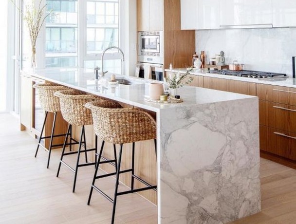 Барная стойка из камня имеет прямоугольную геометрическую форму и минималистичный дизайн. Простое оформление позволит сделать ее гармоничной частью любого современного интерьера: она подойдет для кухни в стиле хай-тек, лофт или минимализм.