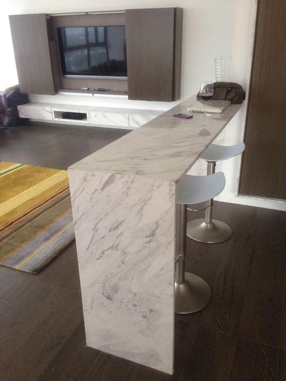 Барная стойка из мрамора оформлена в минималистичном стиле. Она имеет простую геометрическую форму с прямоугольной столешницей и двумя стойками по бокам, конструкция из каменных плит органично вписывается в интерьер современного стиля.