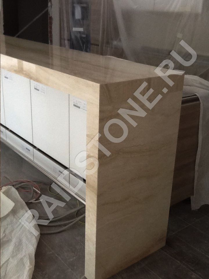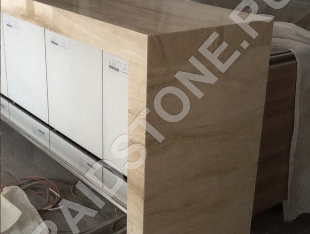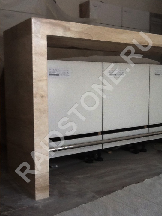 Островная барная стойка из мрамора = хорошее решение для просторной комнаты или студии. Наша компания изготовила барную стойку из мрамора Дайно-Реале – это итальянский мрамор со светло-бежевым оттенком и незначительно выраженным природным рисунком. Этот материал образовался в результате многолетнего наслоения породы, поэтому на поверхности можно встретить следы многолетнего формирования натурального камня.