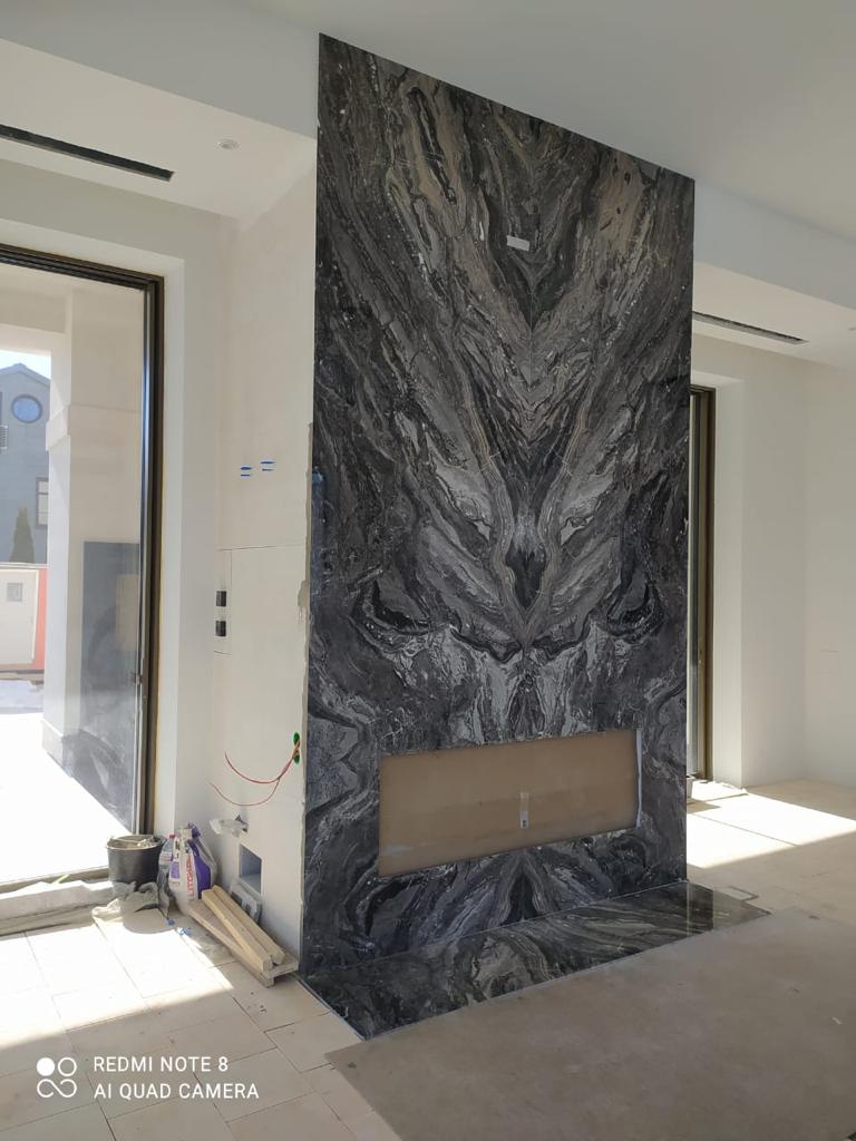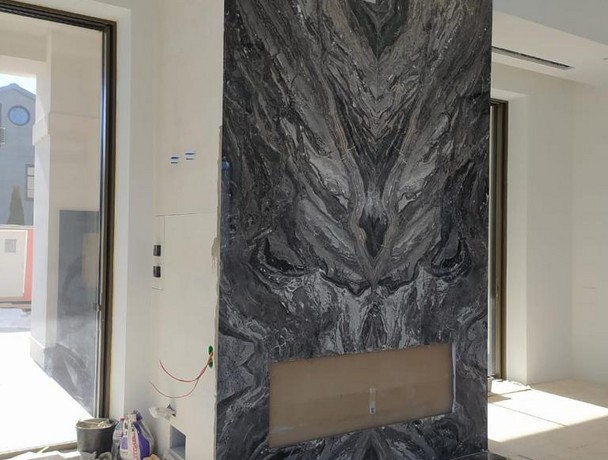 Закажите в компании Raidstone камин из мрамора Арабик: он представляет собой большой портал, занимающий пространство от пола до потолка. Он изготовлен из мрамора темных тонов, плиты подобраны так, чтобы обеспечить симметричный натуральный рисунок. Природный камень имеет почти черный фон с характерными светлыми прожилками. Неравномерно распределенными по поверхности. Минималистичное оформление портала позволит органично вписать его в современный жилой интерьер.