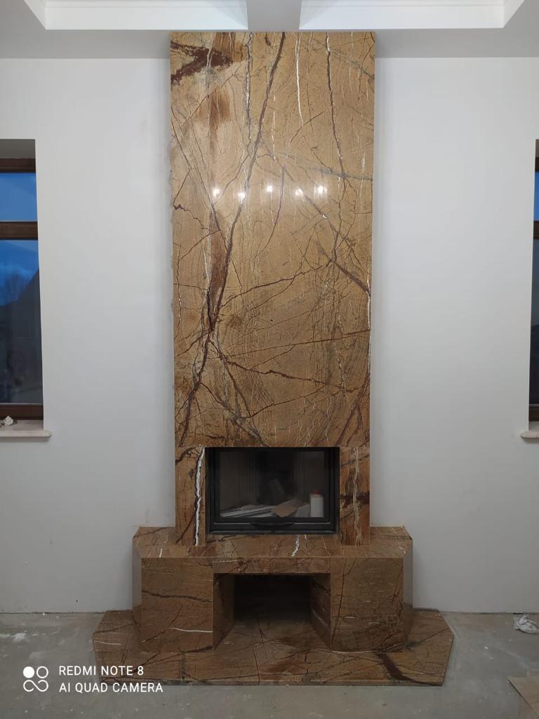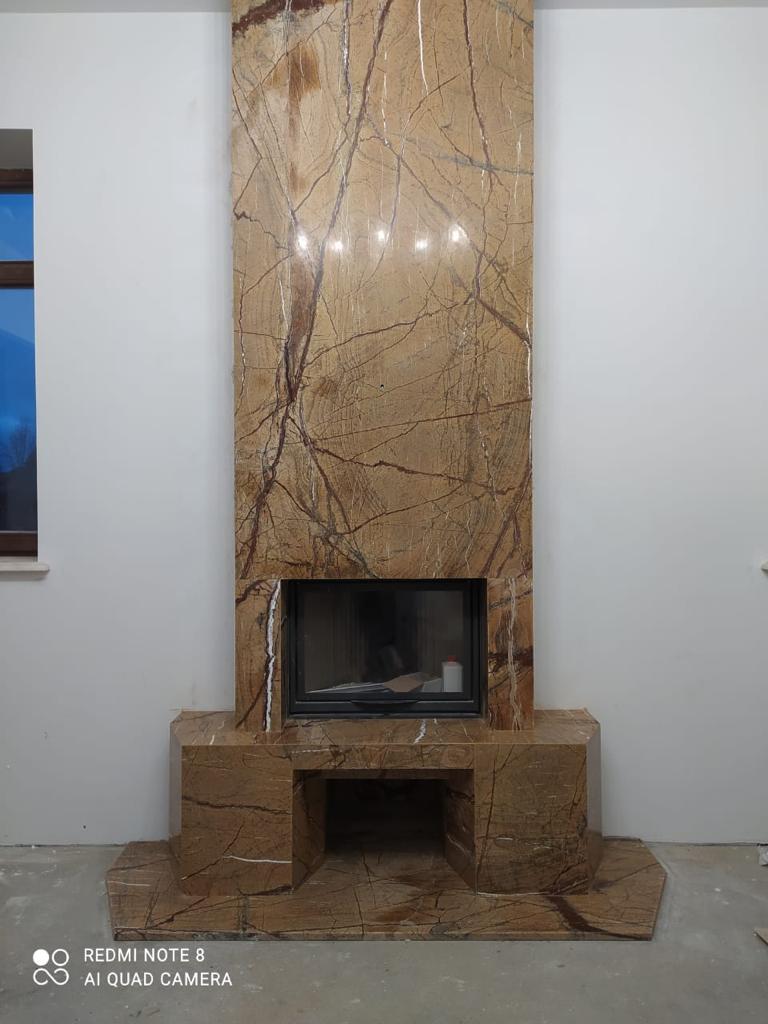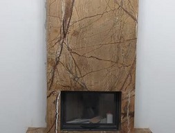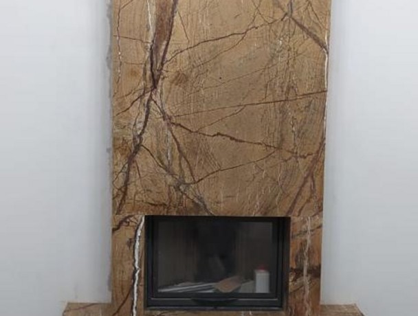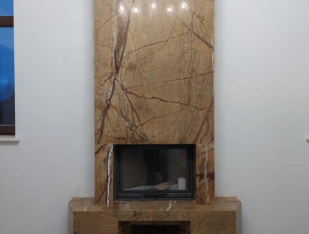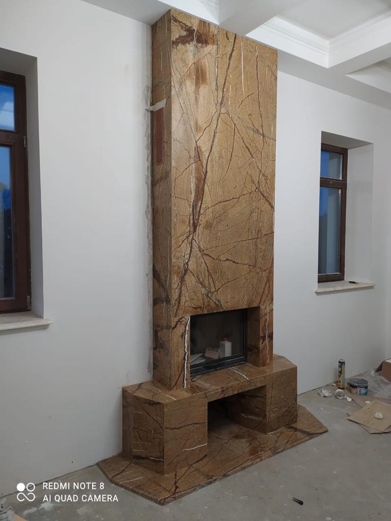 Камин из камня имеет современное минималистичное оформление: он лишен лишних декоративных элементов, полированная поверхность портала занимает пространство по всей высоте помещения от пола до потолка. Для изготовления использован природный камень Бидасар Голд – это экзотический сорт мрамора с золотисто-коричневым фоном, по которому распространены черные и темно-коричневые прожилки. Благодаря теплому оттенку такая каминная облицовка делает помещение уютнее, полировка придает ей приятный блеск.