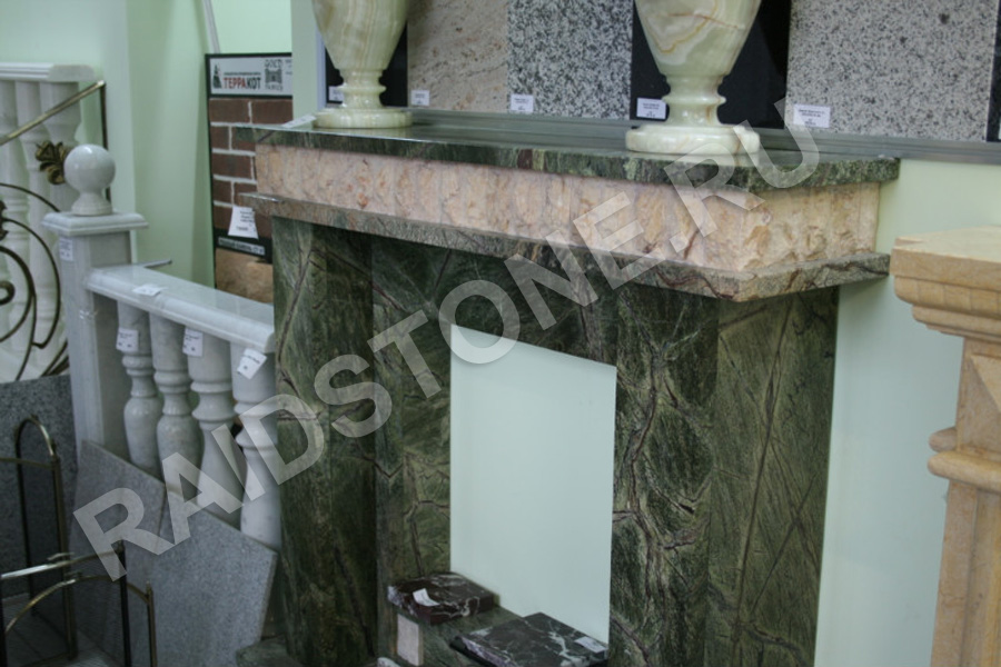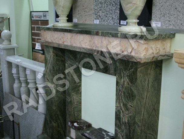 Камин из мрамора Бидасар Грин полированный и Бидасар голд бучардированный