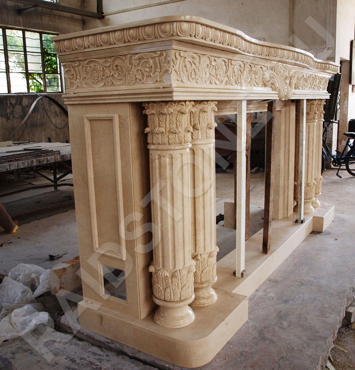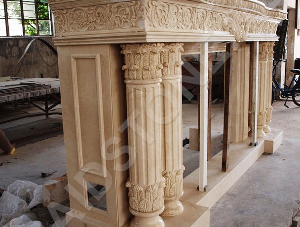 Наша компания предлагает заказать камин из мрамора Galala Extra – это одна из разновидностей бежевого мрамора которая добывается в Египте в окрестностях Каира. На теплом бежевом фоне рассыпаны вкрапления золотистых и коричневых тонов, они формируют уникальный природный рисунок. Камин из камня оформлен в традиционном классическом стиле: в декоре использованы колонны, имитация лепнины, другие декоративные элементы. Резной камень смотрится изысканно, такой камин станет настоящим украшением классической гостиной.