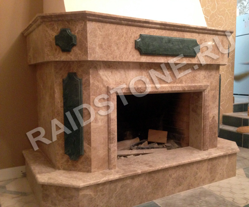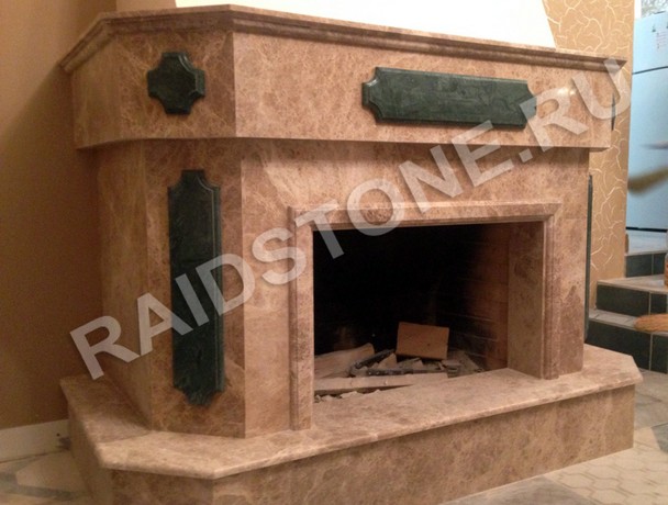 Камин из мрамора Имперадор Лайт с декоративными элементами из Верде Гватемала.