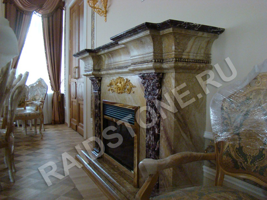 На его фоне эффектно выступает декор боковых частей портала из мрамора Россо Леванте. Темно-красная фактура с фиолетовым оттенком и редкими длинными прожилками белого создает контраст с кремовым фоном природного камня Дайна Реале. Декор в виде колонн с капителями поддерживается резным элементом «под золото» в верхней части в центре портала. Каминная полка выполнена из мрамора Россо Леванте.