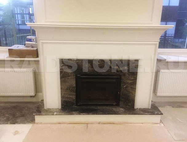 Для центральной части и низа портала выбран итальянский мрамор Гриджио Орбико. Его пастельная цветовая гамма состоит из разных оттенков серого и бежевого. Такое сочетание смотрится элегантно.