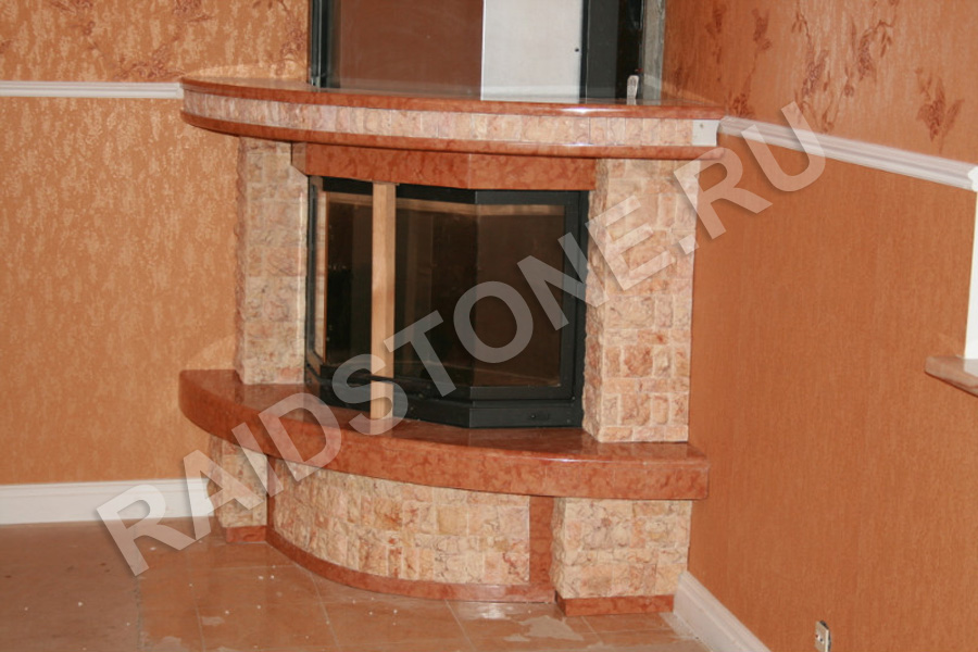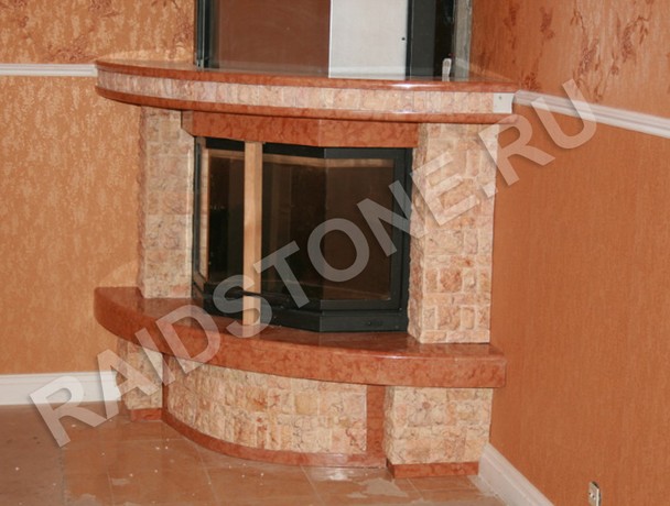 Камин угловой из мрамора Россо Верона полированного и бучардированного.