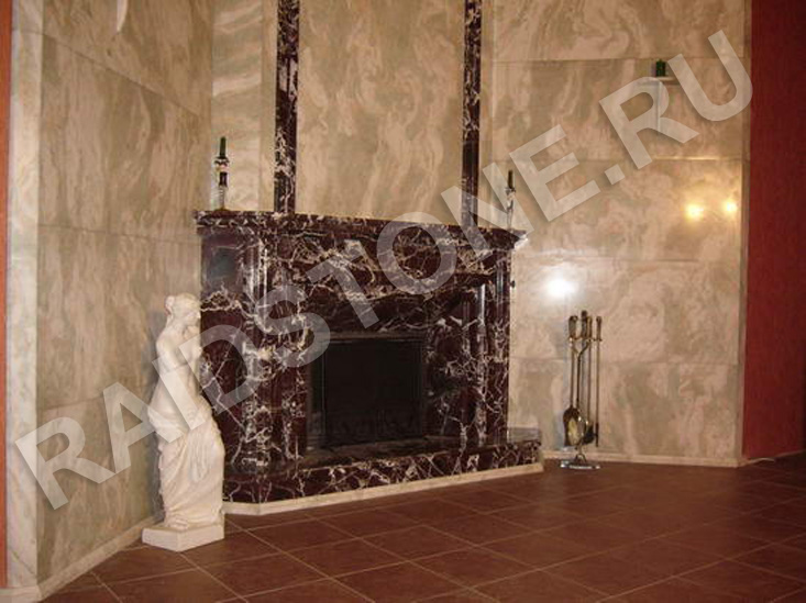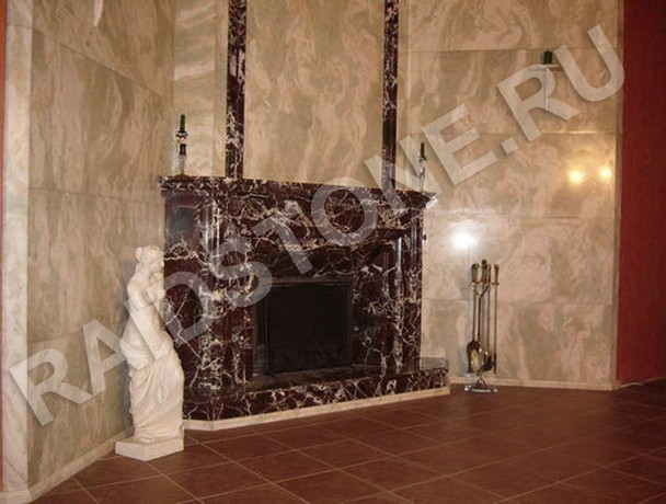 Угловой камин из мрамора Россо Леванте