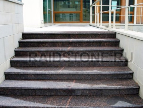 Гранитная лестница изготовлена по персонально рассчитанным чертежам. Толщина ступеней составляет 3 см, подступеней – 2 см. Ступени обладают термообработанной поверхностью, подступени прошли полировку для придания идеальной гладкости. Конструкция лестницы предусматривает 6 ступеней с подступенками, цена одного кв. м. натурального гранита составила 5 555 р.