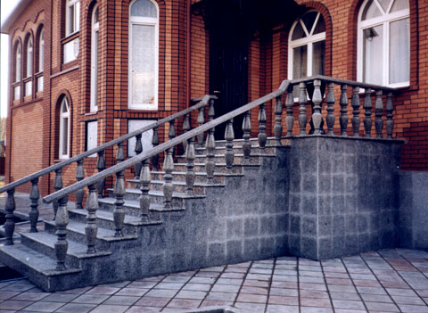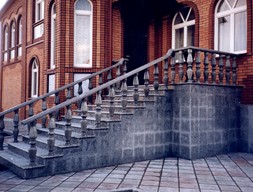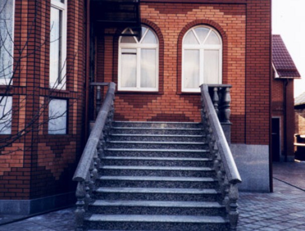 Гранитная лестница имеет ступени толщиной 3 см, для подступенков использована гранитная плитка толщиной 2 см. При изготовлении конструкции тщательно рассчитывается и подгоняется каждый элемент – благодаря этому готовая лестница долго не потребует ремонта.