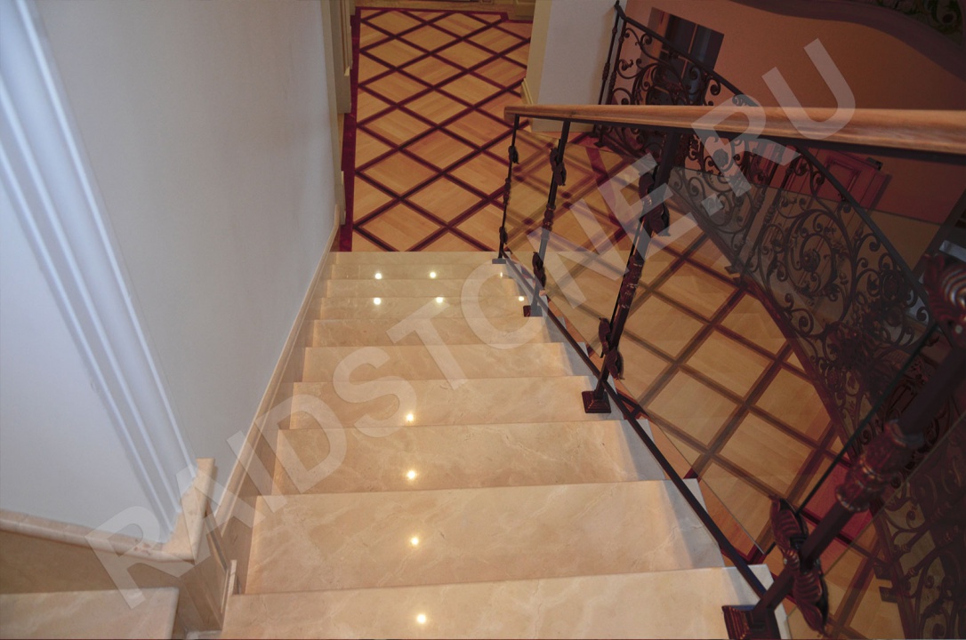 Лестница, плинтус на стене (галошница) и поручень на кованных перилах из мрамора.