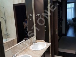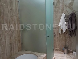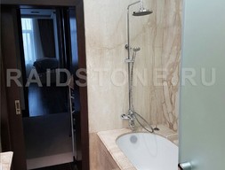 Облицовка пола, стен ванной комнаты слэбами мрамора.
