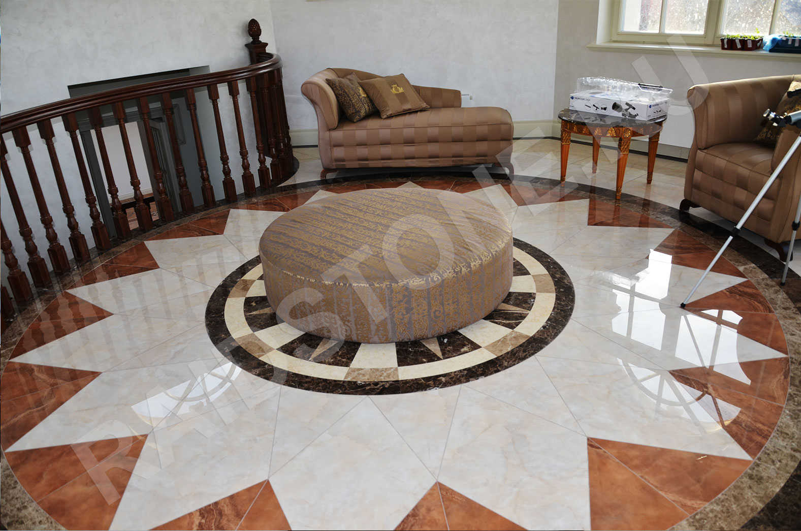 Облицовка пола бельведера мраморной мозаикой гидроабразивной резки.