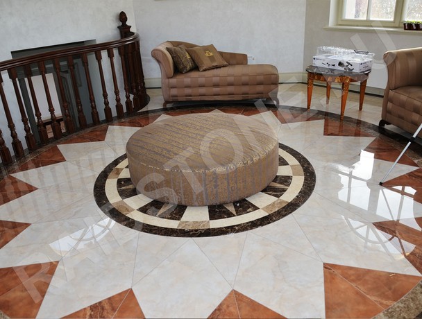 Мраморное панно. Это «рисунки» из разных сортов мрамора, выполненные на заказ заранее. Довольно часто можно встретить этнические узоры, различные орнаменты, флористическую тематику. Также сюда можно отнести мозаику, или, например, узор, имитирующий восточный ковер.