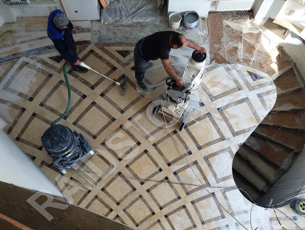 Облицовка пола в частном доме мрамором гидроабразивного реза (в процессе монтажа и полировки)
