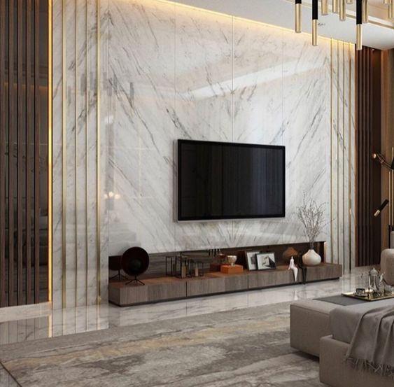 - Тщательная подгонка по размерам. Благодаря точным расчетам гармоничный симметричный рисунок занял пространство от пола до потолка, на нем контрастно смотрится черный экран плазменной панели.