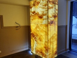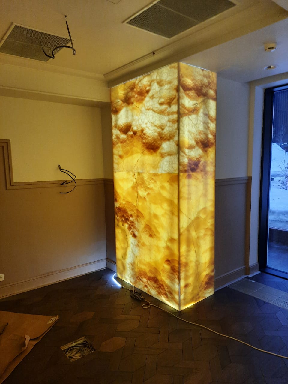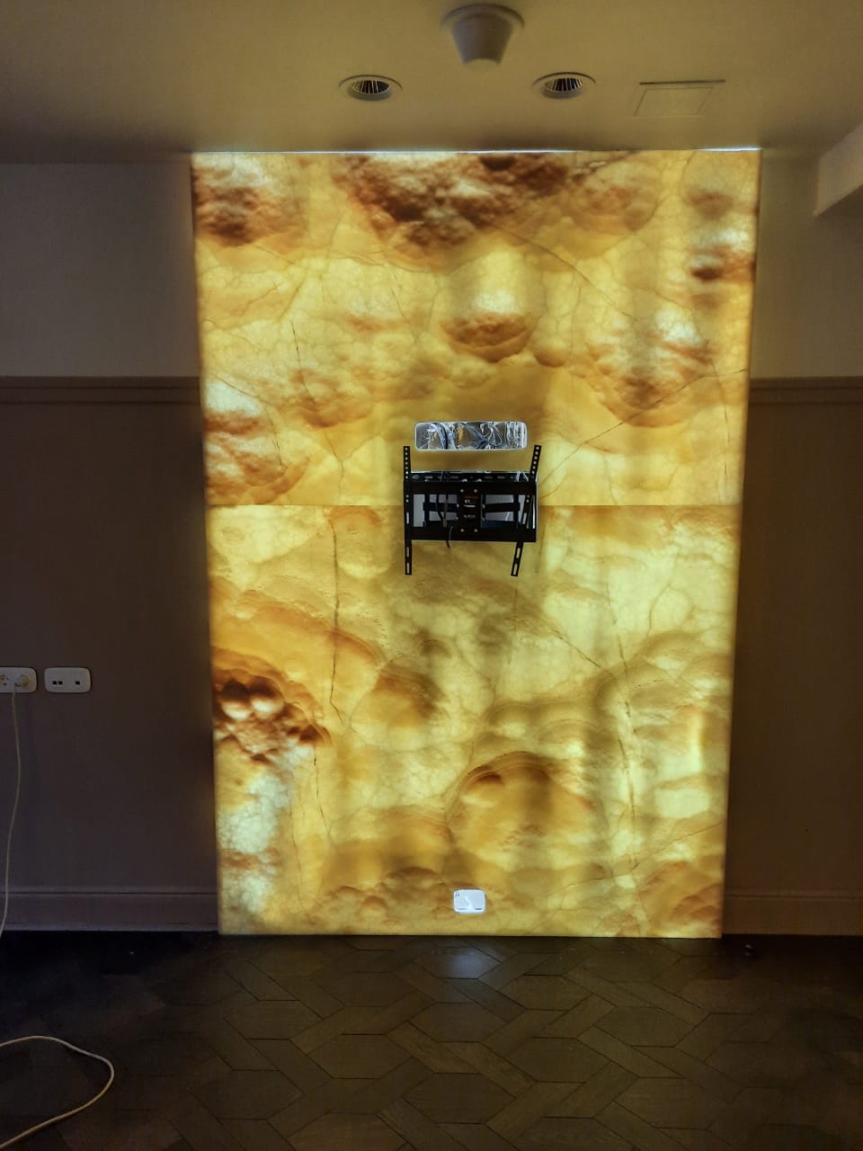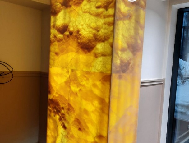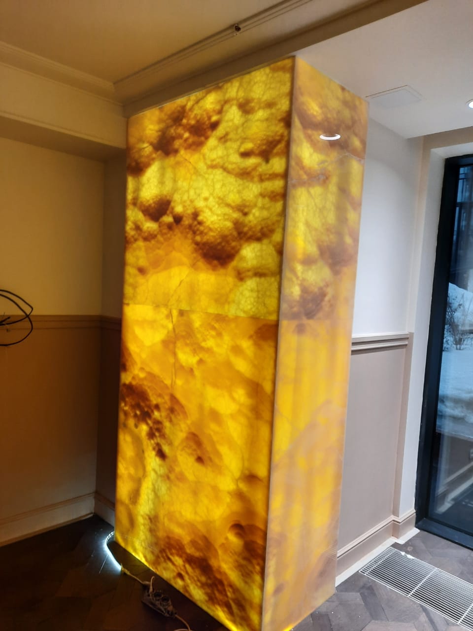 Перед установкой панно слэбы из оникса проходят шлифовку, полировку, после установки проводится проклейка швов. В результате образуется идеально гладкая и ровная поверхность, каменное украшение смотрится гармонично и органично вписывается в любой интерьер.