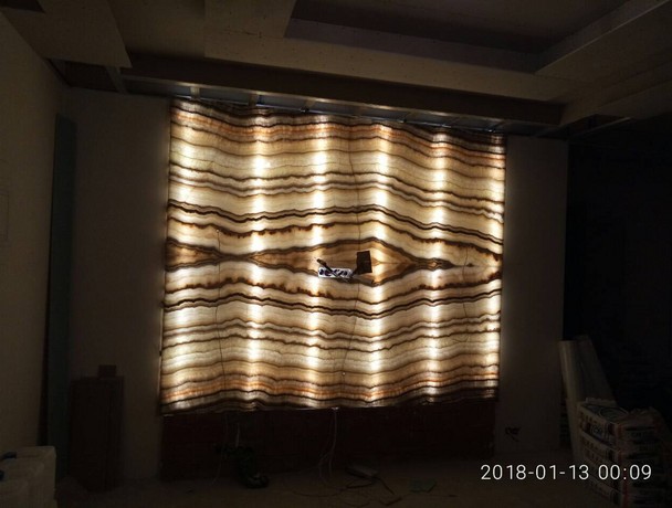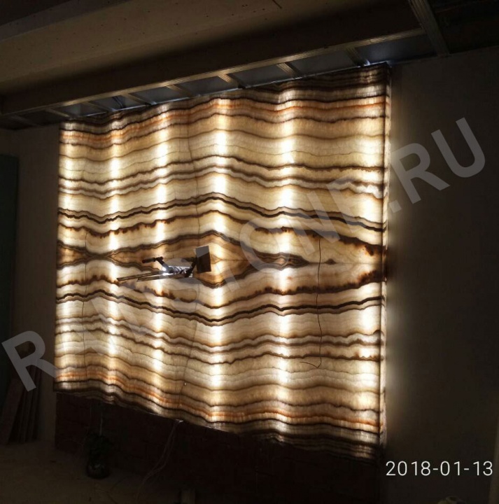 Наша компания изготавливает декоративные панно из оникса с установкой на стену и подключением светодиодной подсветки. Одной из последних работ компании Raidstone стало панно из итальянского оникса Миэль, предназначенное для установки под телевизор. Оникс – уникальный природный камень со слоистой структурой и светопроницаемостью. Слои минерала образуют уникальный природный рисунок, он будет неповторимым для каждого слэба.