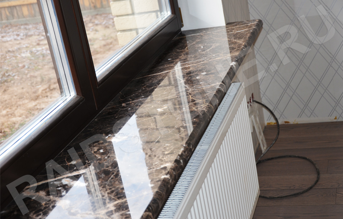 Подоконник из мрамора добавит интерьеру солидности и респектабельности. Природный камень привлекает взгляд эффектным рисунком прожилок и гармонией оттенков основного цвета. Мрамор Emperador Dark органично сочетается с отделкой и мебелью из натуральной древесины темных тонов.
