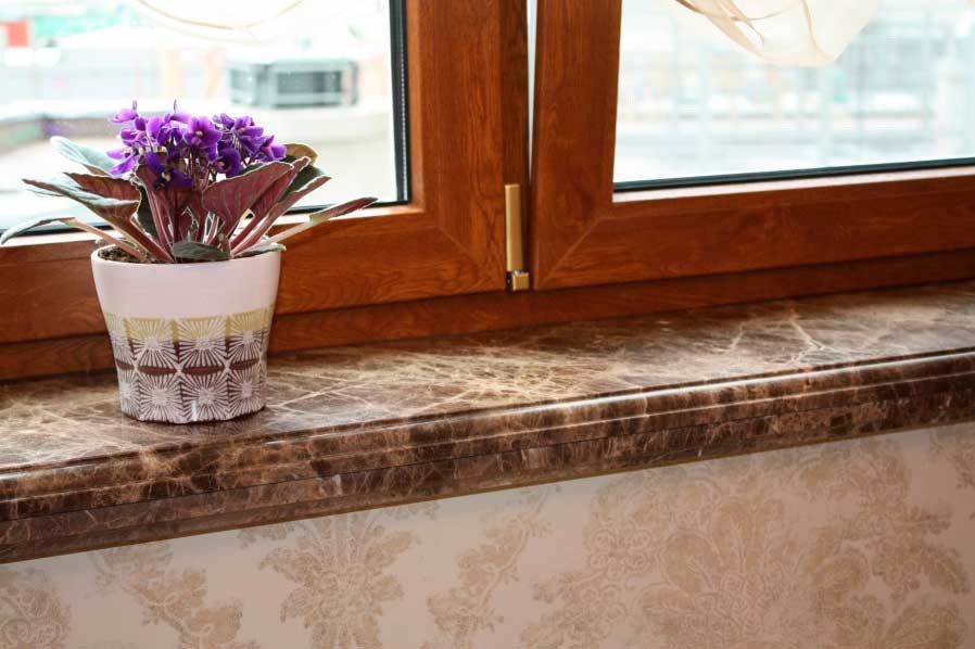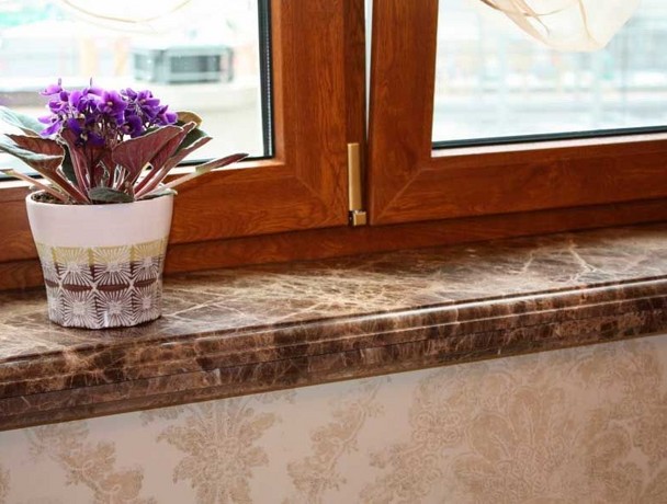 Изделие изготавливается из мраморной плиты коричневого оттенка с прожилками толщиной в 30мм. Размеры рассчитываются индивидуально. Подоконник имеет полированную поверхность и фигурную кромку.