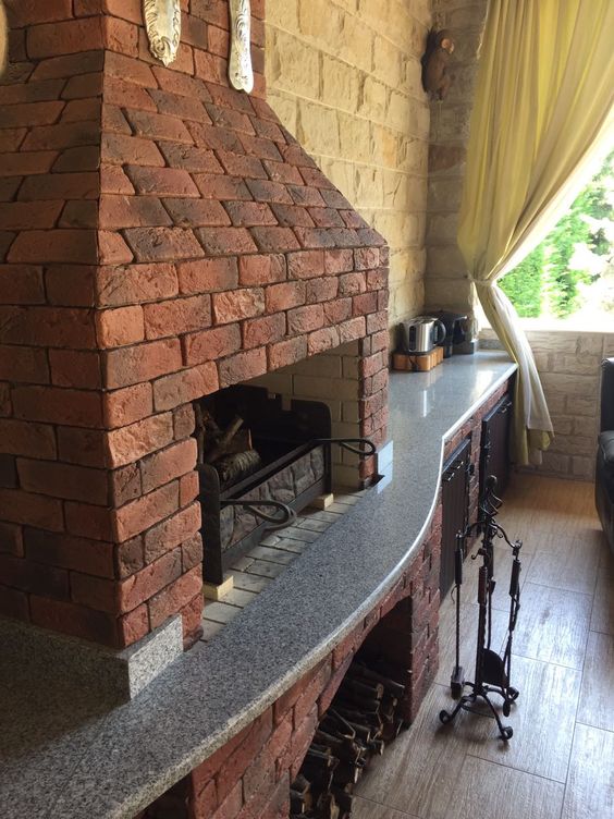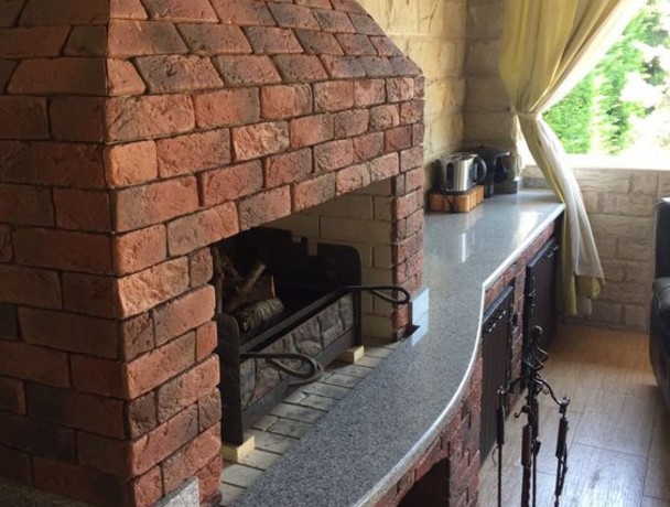 Элегантная столешница для барбекю сделана из прямоугольных плит и закругленной панели, которая огибает печь. Небольшой по площади конструкции достаточно для устройства компактной кухонной зоны, где можно нарезать ингредиенты, хранить посуду и раскладывать готовые блюда по тарелкам. По бокам печи установлен каменный плинтус, он эстетично закрывает монтажный шов между жаровней и горизонтальной поверхностью. Торцевая кромка обработана и лишена острых углов.