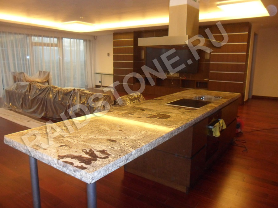 Прямоугольная столешница, соединяющая в себе рабочую и обеденную зону, изготовлена из светло-серого бразильского гранита Крейзи Хорз. Кромка обработана по колотой технологии, поверхность шлифованная, размер 2300х620х60мм, с подклейкой.
