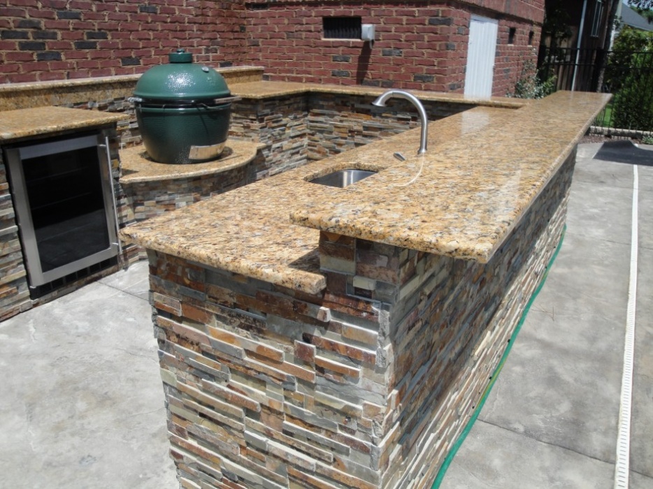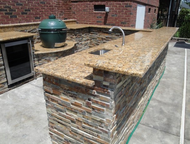 П-образная столешница для барбекю имеет несколько функциональных зон: для мойки, резки продуктов, приготовления и выкладки блюд. Конструкция хорошо сочетается с кирпичом, плиткой, искусственным и натуральным камнем.
