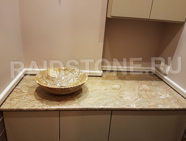 Нежные переходы оттенков и идеальные формы камня достигаются путем тщательного отбора, аккуратной обработки и постепенного доведения до идеала. Предлагаем заказать столешницу для мебели ванной комнаты из мрамора Дайно реале из нашего каталога. Сохранен природный окрас, обеспечена гладкость, защита от воды.