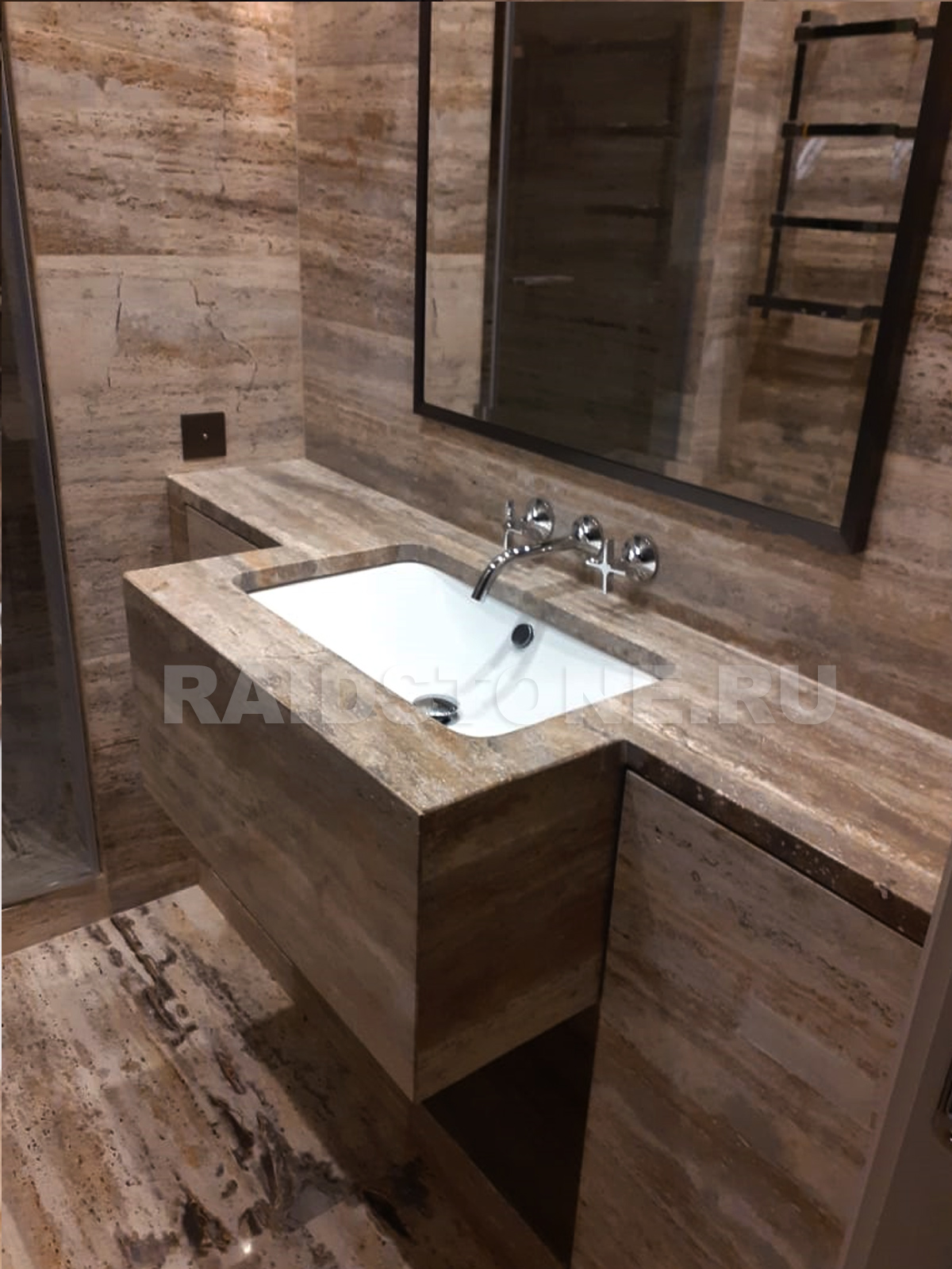 Материала облицовки: слэбы травертин Сильвия (Италия). Мебель в ванной, полки, тумба и раковина - дают завершенный вид для интерьера ванной. Материал был выбран по образцу, предоставленному дизайнером и архитектором интерьера. После долгих поисков среди поставщиков мы нашли соответствующий образцу камень. Но, так как натуральный камень имеет свой рисунок, свои каверзны, разные оттенки на одном слэбе, вышло так, что с одного слэба использовалось меньше половины. Изготовление подвесной раковины с подконструкцией так, чтобы она выдержала вес самого камня, мойки - особо сложная часть работы. Но у нас вышло все красиво!