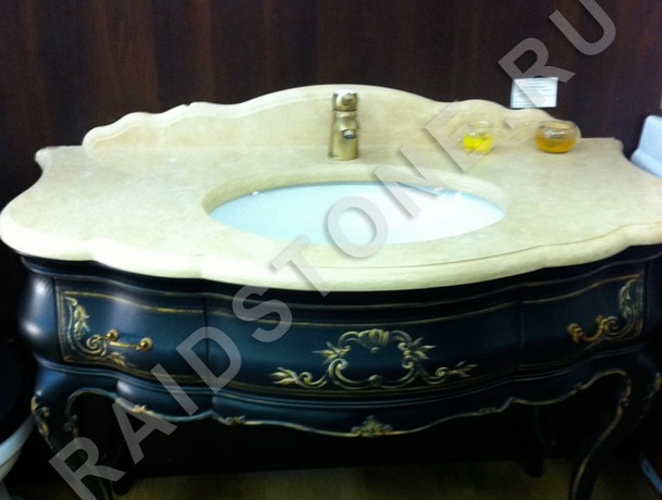 Прочность, долговечность, роскошная текстура, привлекательное сочетание оттенков, все это относиться к изделиям из натурального камня. Предлагаем заказать столешницу для ванной комнаты из мрамора Rosso Portugallo, получившую светлый окрас и неповторимую конфигурацию. Мы выполняем изготовление, подбор, также возможен монтаж.
