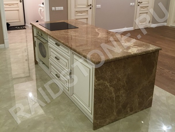 Столешница и остров с боковыми панелями на кухню из мрамора Имперадор лайт.