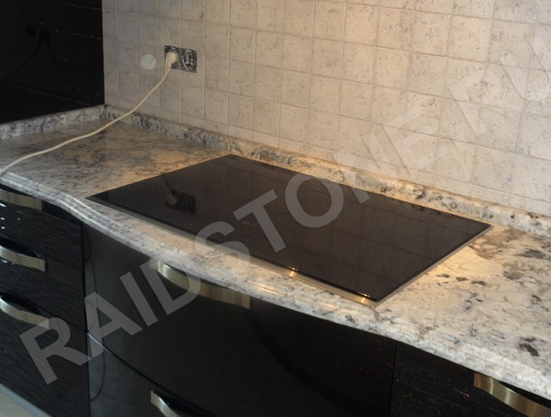 Столешница прямоугольной формы изготавливается из гранита Айс Вайт белого цвета и эффектными серыми разводами. У нее имеется фигурная кромка, готовые вырезы под мойку, плиту, электропроводку и смеситель. Размер 1800х650 х30мм., поверхность полированная