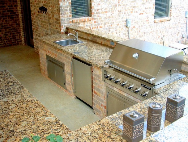 П-образная столешница для барбекю имеет несколько функциональных зон: для мойки, резки продуктов, приготовления и выкладки блюд. Конструкция хорошо сочетается с кирпичом, плиткой, искусственным и натуральным камнем.