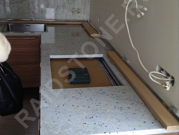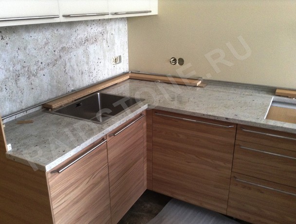 Столешница и фартук для кухни из гранита бело-серого гранита.