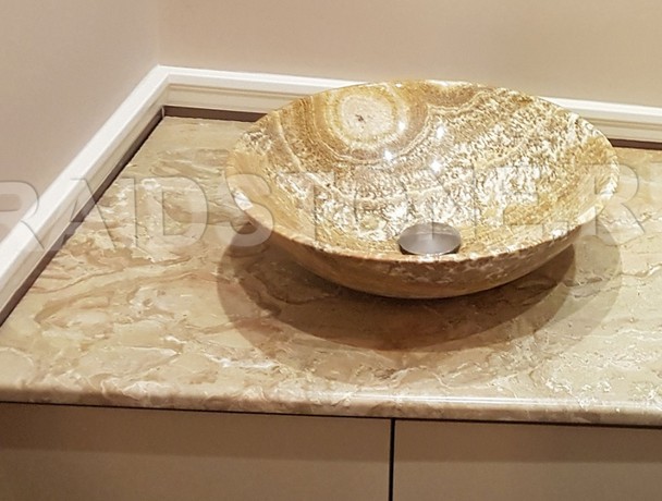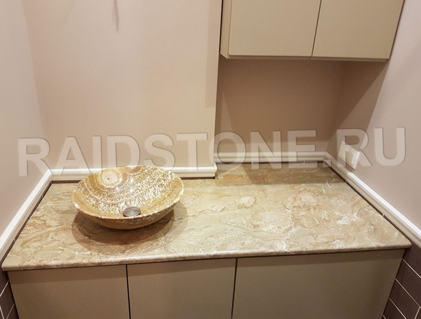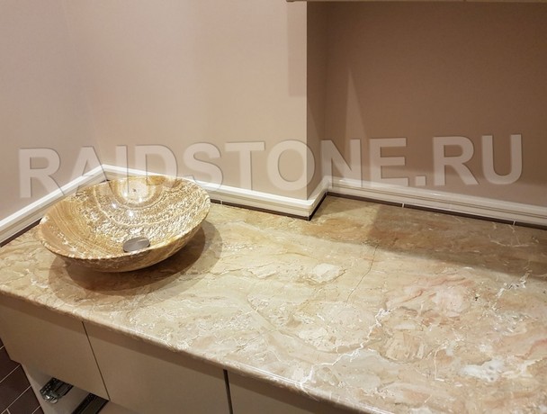 Нежные переходы оттенков и идеальные формы камня достигаются путем тщательного отбора, аккуратной обработки и постепенного доведения до идеала. Предлагаем заказать столешницу для мебели ванной комнаты из мрамора Дайно реале из нашего каталога. Сохранен природный окрас, обеспечена гладкость, защита от воды.