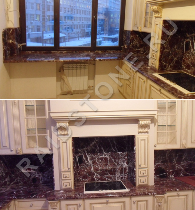 Столешница с фартуком и с подоконником из мрамора Россо Леванто