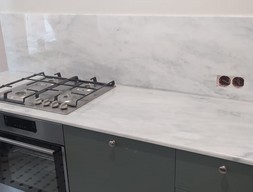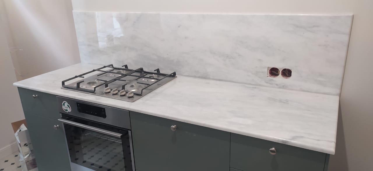 Строешница с фартуком на кухню из мрамора Мугла Вайт
