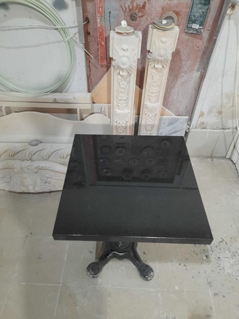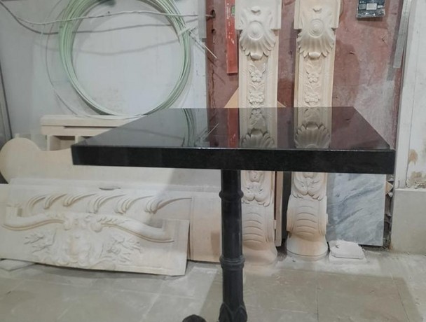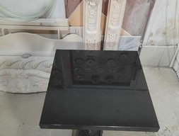 Стол для кафе изготовлен из природного камня – для изготовления столешницы использован гранит Абсолют Блэк. Это наиболее популярный сорт гранита, доставляемый из Индии. Его особенностью стал глубокий черный цвет, в котором могут встречаться незначительные серые прожилки. Благодаря полировке поверхность из камня обладает приятным блеском, при этом она будет устойчива к появлению царапин. На каменную столешницу можно без опасений ставить горячую посуду – на ней не останется следов.