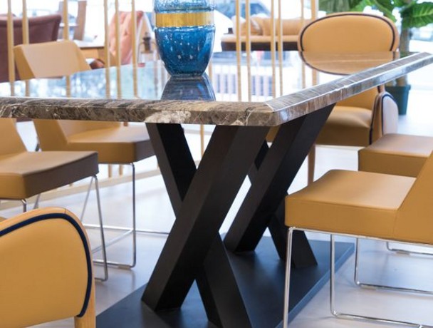Натуральная каменная столешница установлена на скрещенные деревянные ножки. Материал окрашен в черный цвет: он гармонично сочетается с серо-белой поверхностью столешницы. Благодаря использованию только природных материалов такой стол подойдет для интерьера кафе в эко-стиле. Закажите мебель собственного производства по выгодной цене онлайн, гарантируется быстрая доставка.