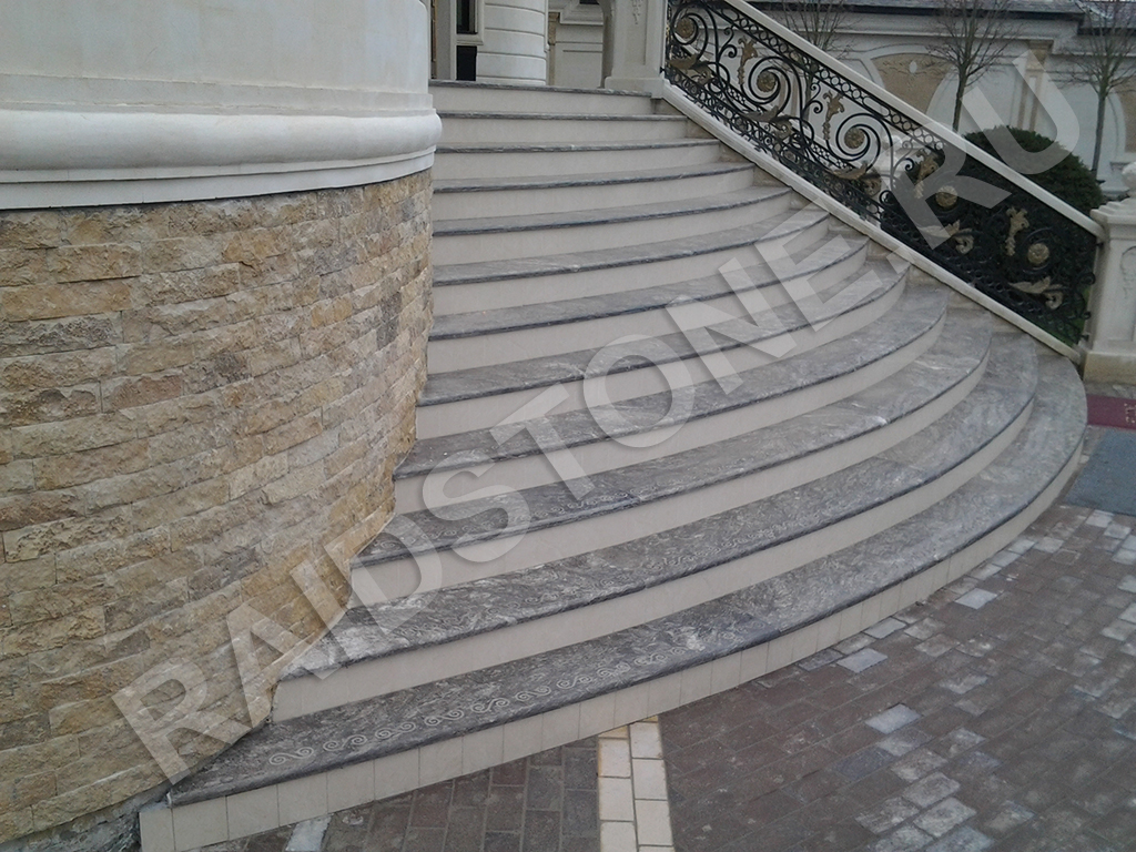 Ступени из бразильского гранита Кайрус с нанесением орнамента вместо противоскользящей полосы.