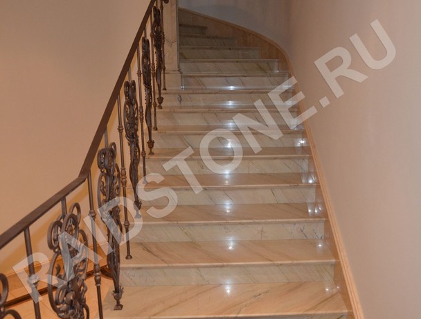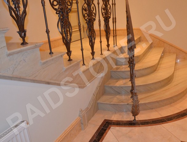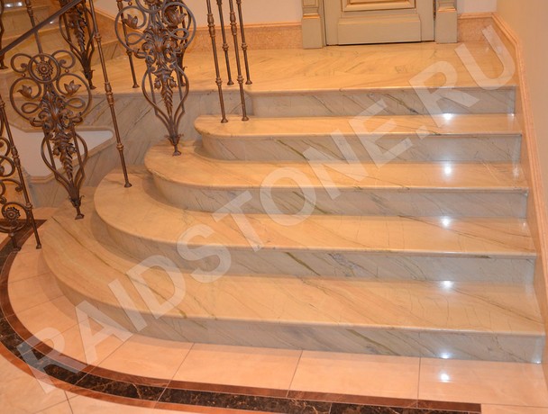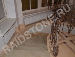 Компания RAIDSTONE выполняет облицовку лестниц на заказ мраморными ступенями с использованием натурального камня Аквамарина. Камень имеет приятный теплый оттенок бежевого и песочного оттенков с тонкими прожилками в тон.